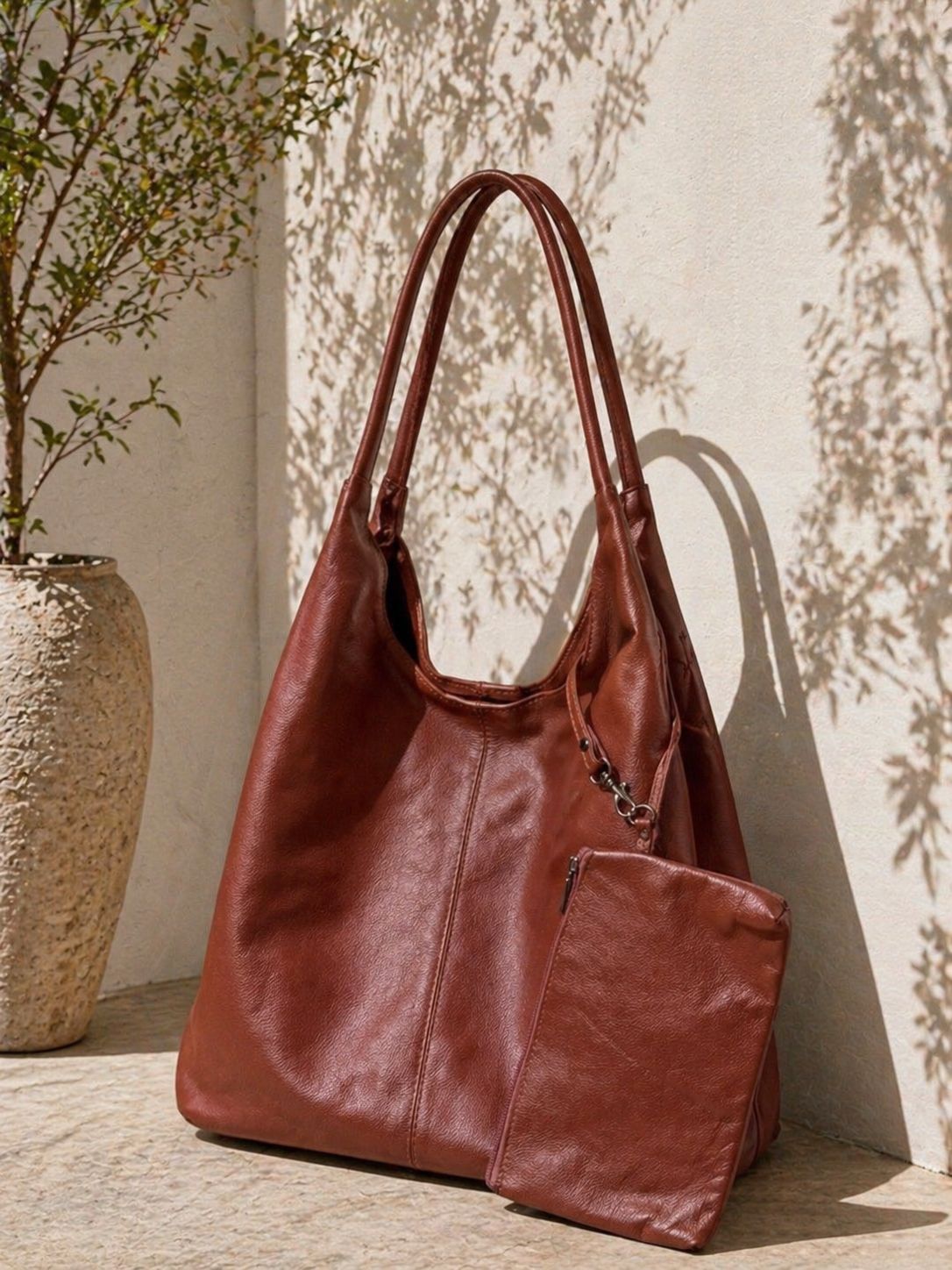 Bolsa Tote Marrom OneStory é confeccionada em couro legítimo, com estrutura maleável. Fechamento de pressão, acompanha necessaire de couro na mesma cor. Tamanho: 35cm de largura x 30cm de altura (sem a alça). Necessaire: 24cm x 15cm